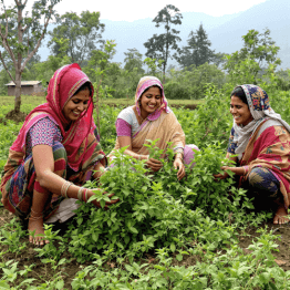 Die regelmäßige Ernte von Feldminze ist aufgrund ihres angenehmen Aromas eine beliebte Tätigkeit unter den nepalesischen Frauen vor Ort und hat sich fast zu einem gesellschaftlichen Ereignis entwickelt. Wenn sich die Frauen zur Minzernte versammeln, ist das nicht nur Arbeit – es ist eine Zeit lebhafter Gespräche, des Lachens und der Weitergabe von Erfahrungen an die jüngeren Generationen. Der Duft der frisch gepflückten Minze vermischt sich mit den Klängen ihrer Gespräche und schafft eine Atmosphäre des Friedens, der Liebe und der Entspannung. Feldminze, oder Mentha arvensis, ist aufgrund ihrer vielfältigen Verwendungsmöglichkeiten in einer Vielzahl von ayurvedischen Teesorten (z. B. Alochaka-Gesundheitstee und Pitta-Dosha-Tee) enthalten.