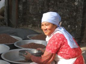 Bevor ein Kraut für die weitere Verarbeitung verwendet wird, breiten Jawahar Lal und sein Team es zunächst auf der Terrasse ihrer Kräuterproduktionsstätte aus, damit es in der Sonne gründlich trocknen kann und keine Feuchtigkeit zurückbleibt. Anschließend reinigen nepalesische Frauen die Kräuter von Hand und bereiten sie für die Verwendung in ayurvedischen Mischungen vor. Sie arbeiten äußerst sorgfältig: Sie breiten jedes Kraut auf einem Strohtablett aus und entfernen unerwünschte Teile der Pflanzen von Hand. Zuerst reinigt eine Frau das Kraut, dann gibt sie das Tablett zur Kontrolle an eine zweite Frau weiter, und dann an eine dritte Frau, bevor das Kraut mit anderen Kräutern gemischt werden kann. Fein gemahlene Verunreinigungen werden dann entfernt, indem der gesamte Inhalt des Tabletts leicht in die Luft geworfen wird, ganz im Sinne der ayurvedischen Weisheit: „Was schwerelos ist, wird wegfliegen, was wertvoll ist, wird erhalten bleiben.“ Jede Bewegung ist somit ein echtes Ritual.